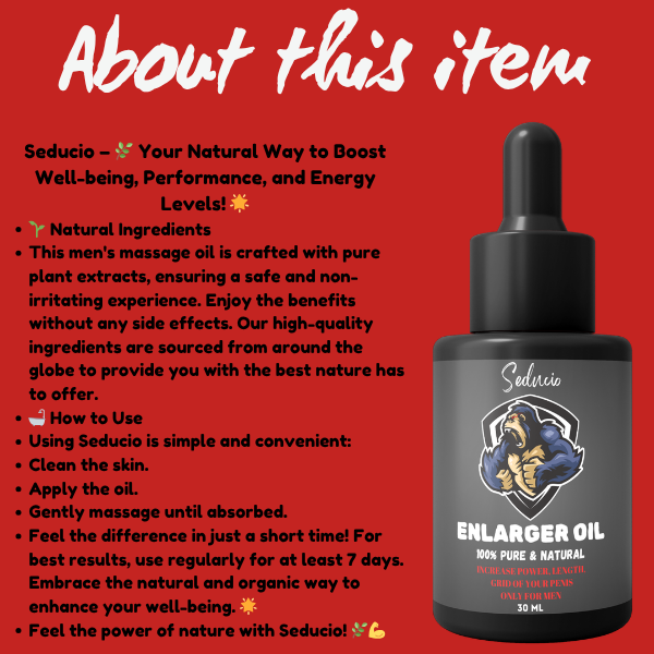 SEDUCIO Enlarger Oil is a premium herbal oil designed to support male confidence, improve comfort, and enhance overall performance. Its carefully crafted formula helps promote better circulation and skin conditioning, making it a suitable addition to your personal care routine.